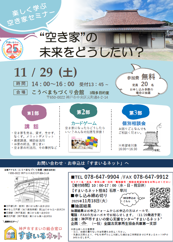 【第1部】講話(14:00~) ・空き家を売る、貸す、生かす、なくす。メリットデメリット 【第2部】カードゲーム<グループワーク>(15:20~) “実家が空き家に、あなたはどうする?”などのお題カードで 【講座終了後】個別相談会(希望者、16:00~16:30) |